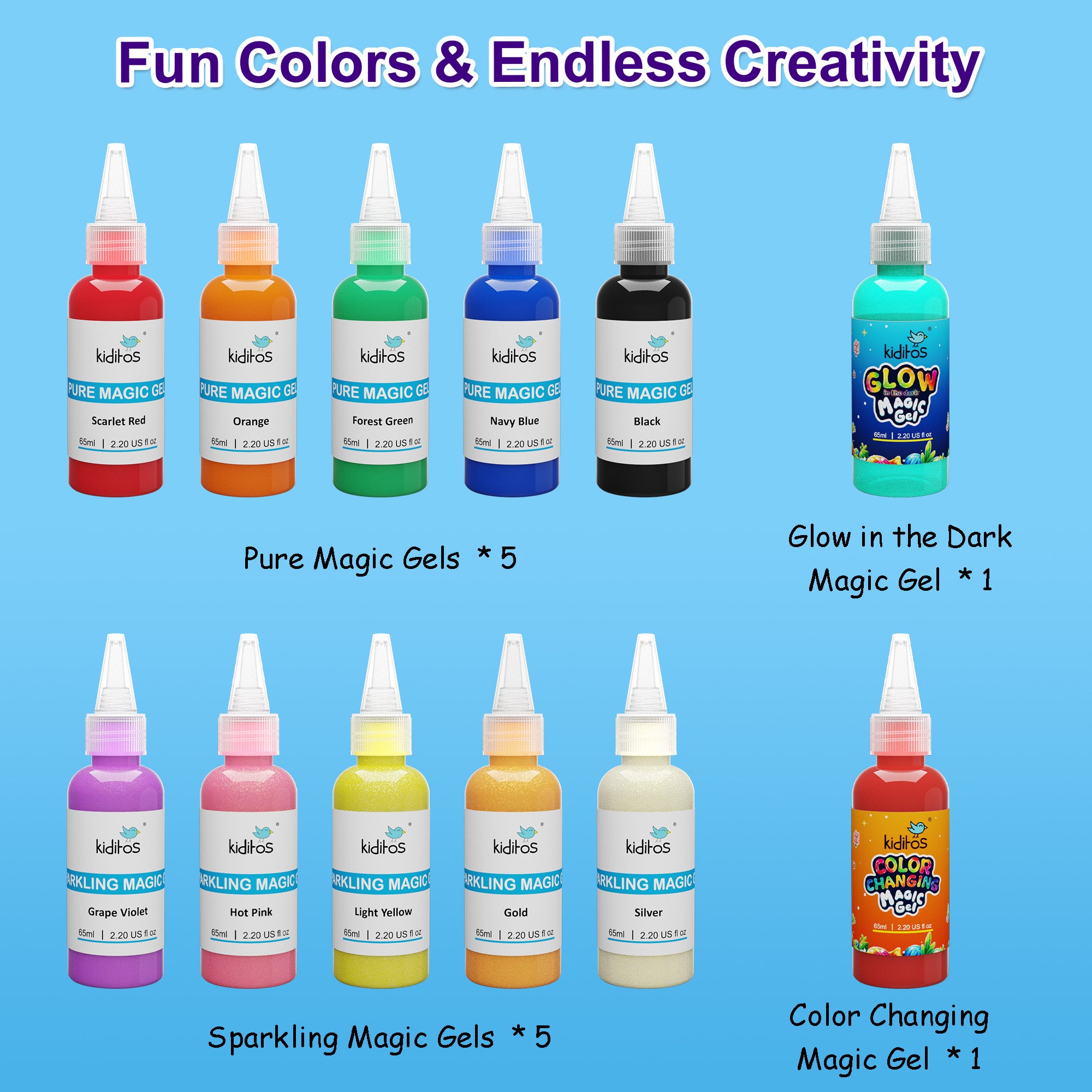 12 Vibrant Colors Gel Refills Set–Includes 5 pure gels (Scarlet Red, Orange, Forest Green, Navy Blue, Black), 5 sparkling gels (Silver, Gold, Hot Pink, Light Yellow, Grape Violet), 1 glow in the dark, and 1 color changing gel.