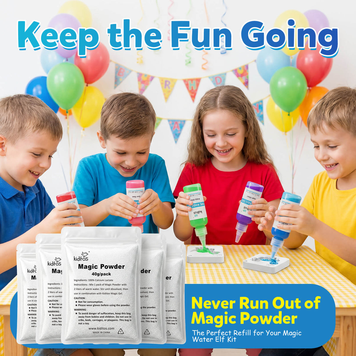 Keep the fun going with Kiditos magic powder refills. These handy refill packs help replenish your Water Elf solution so kids can continue making and playing with their favorite creations.